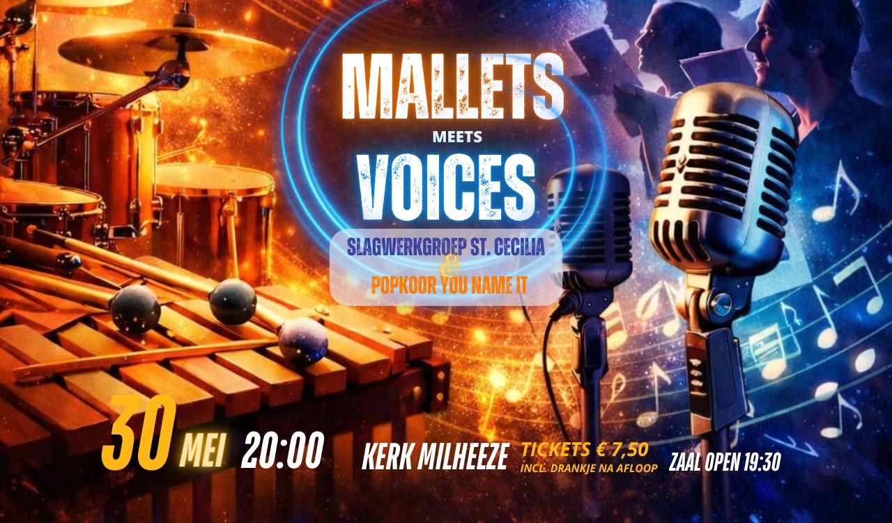 Een uniek concert op een unieke locatie door de slagwerkgroep van St. Cecilia Milheeze in samenwerking met het popkoor You Name It. Een afwisselend programma, waarbij slagwerk en zang wordt gecombineerd. Geniet van de mooie sounds van de mallets de slagwerkers en de fraaie voices van het koor. Dit is het laatste concert wat in de kerk van Milheeze plaatsvind. Mis deze unieke kans niet!